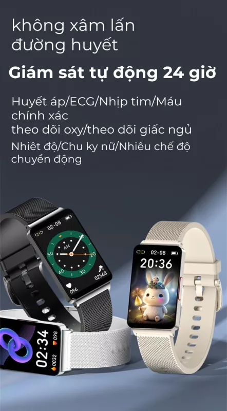 - Theo dõi huyết áp, đo lượng đường trong máu, đo nhiệt độ, đo ECG, thông báo tin nhắn thời tiết, đồng hồ báo thức,