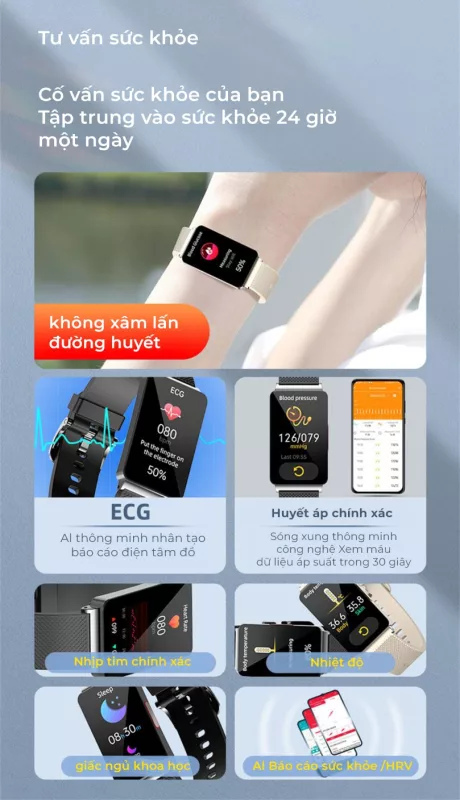 - Điện tâm đồ + chip chăm sóc, đo huyết áp, oxy máu, nhịp tim, nhiệt độ cơ thể