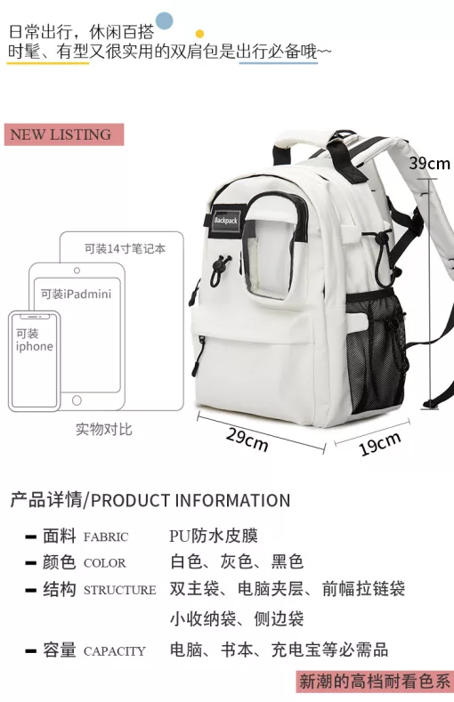 Mặt trước balo gồm 2 ngăn nhỏ tiện lợi – 2 bên hông balo có 2 ngăn phụ đựng chai nước, ô – Khóa kéo loại xịn siêu bền – Quai đeo balo có đệm xốp êm ái, đeo cả ngày không mỏi – Balo có đai ngực trợ lực –