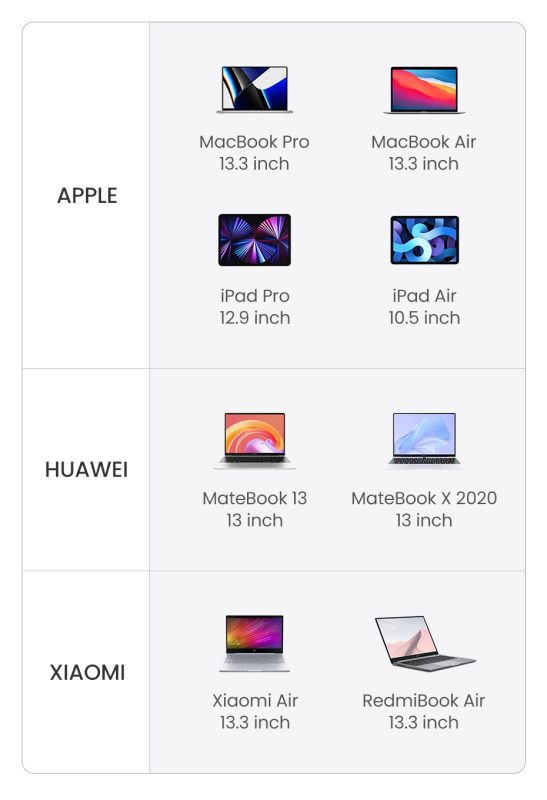 1. Macbookmacbook 12”/macbook air 13/ macbook air 13.3”/macbook pro 13.3” microsoftsurface pro 6/4/3 asuszenbook 13.3”/vivobook 13.3”/ chromebook 12.5”/flip c434 dell dell xps 13/latitude e7250 hphp ghen tị x360 13.3”/spectre×360 13.3”/stream13 lenovoyoga 720 13”/thinkpad 13”/ mlx320 huaweimatebook 12′ x27;’ 13”/matebook e 12”/ matebook x 13” xiaomixiaomi không khí (13,3 inch) ……